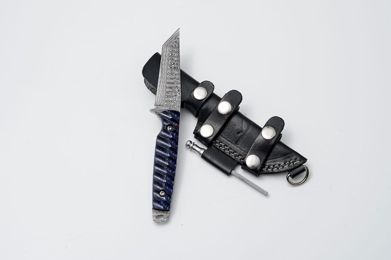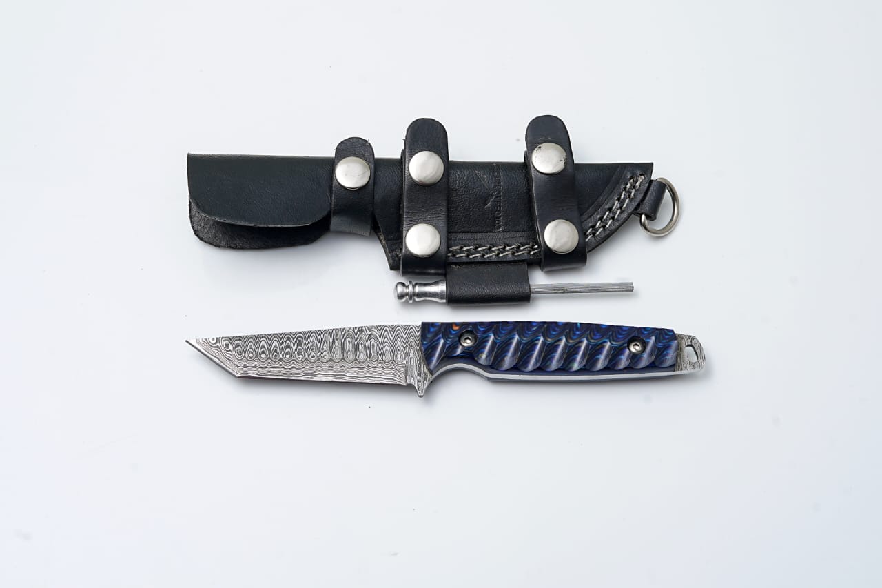 Hand-Forged Full Tang Damascus Tanto Knife – 3D Textured Blue G10 Handle with Sheath & Sharpening Rod